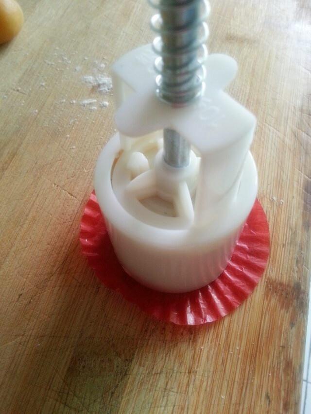 包好的月饼胚表面粘上熟的防粘的手粉,然后放在月饼模中压制成品,这样可以防粘,保证成品形状美观。