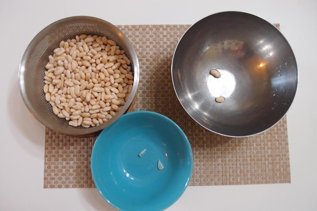 抹茶芸豆馅儿:白芸豆提前一夜泡入足量水中,泡到芸豆胀大,用手一颗颗去皮后放入装了足量水的锅中,中火煮1个小时左右直到一捏就烂的程度;