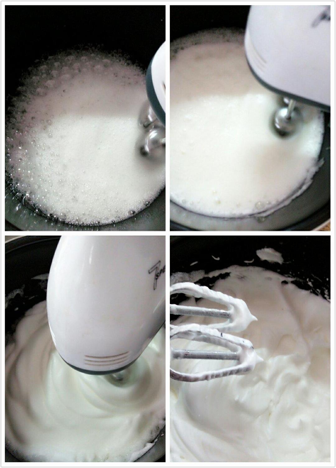 用电动打蛋器把蛋白打到呈鱼眼泡状时,加入准备好的加蛋白的91克细砂糖的三分之一,继续撑打到蛋白开始变浓稠时,再加三分之一的细砂糖,再继续搅打,到蛋白比较浓稠,表面出现纹路的时候,加入剩下的三分之一的细砂糖,再继续打一会儿,提起打蛋器的时候,蛋白能拉出一个短小直立的尖角,就表明达到了干性发泡的状态了,可以停止搅打,