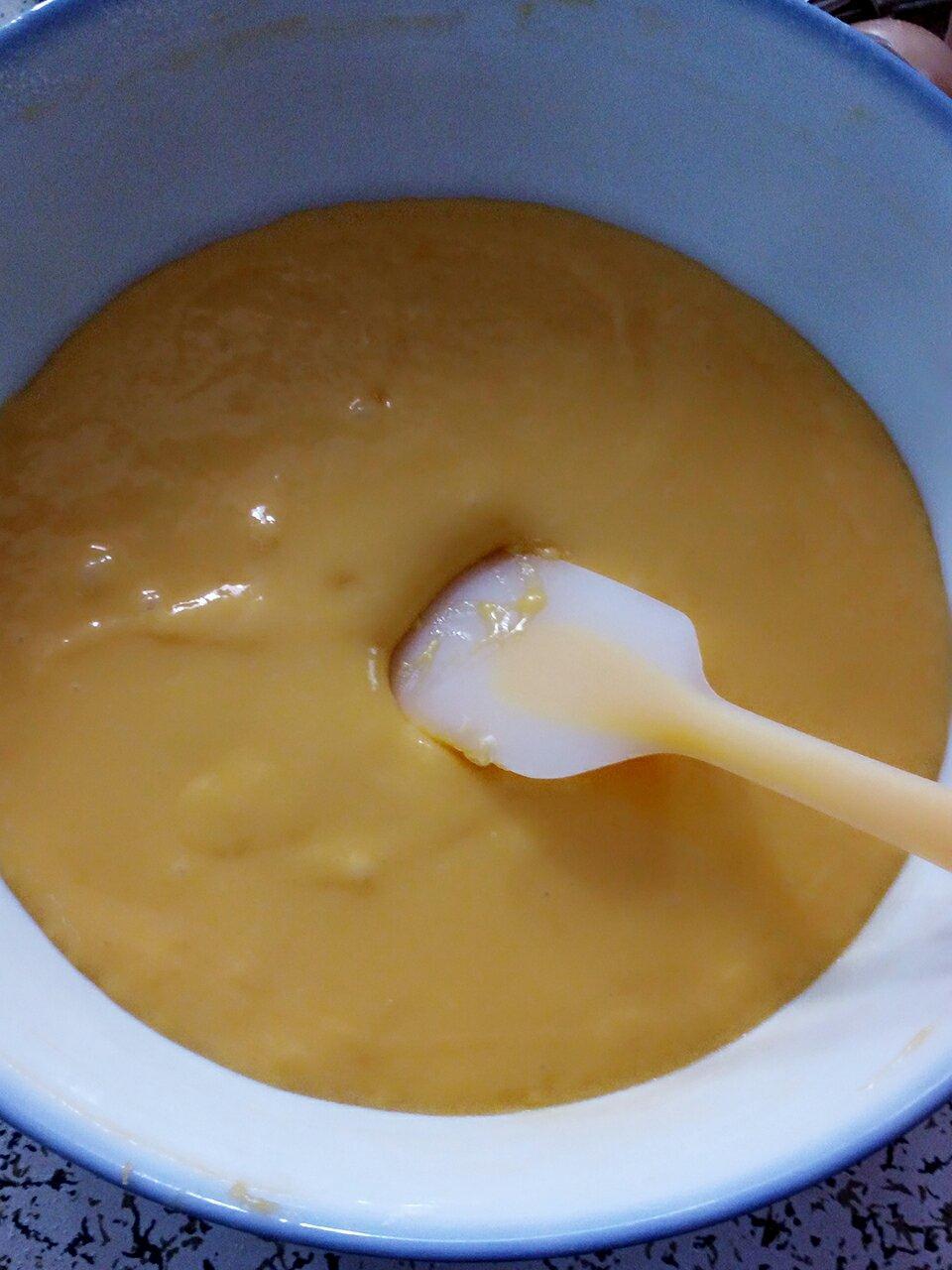拌好的面糊全部倒入装蛋白的盆里,使用切拌和翻拌的方式,拌至蛋白与面糊完全融合。(混合好的是比较浓稠均匀的浅黄色)。