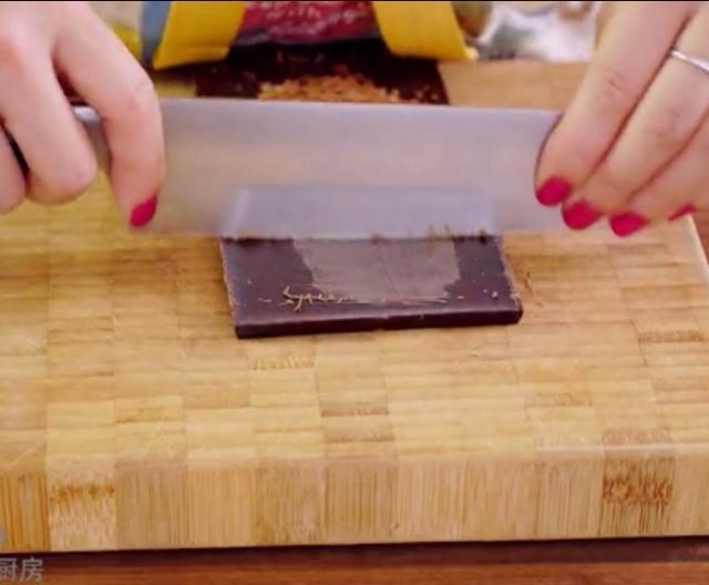 用刀在巧克力上面往自己的方向刮出巧克力碎