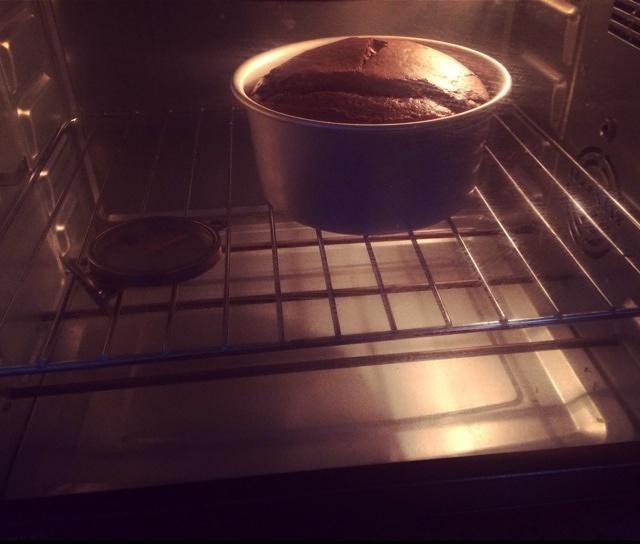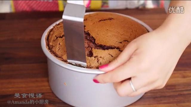 用牙签插入蛋糕…拔出如果没有粘到面糊就可以。拿出来轻震两下震出热气然后倒扣…下面悬空,待冷却,大概45分钟到60分钟