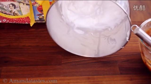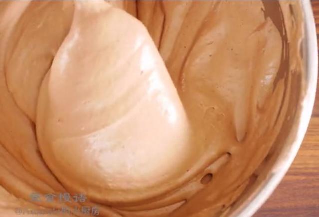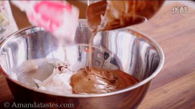 然后再倒入蛋白中,同样手法翻伴。可可粉有消泡作用…所以尽快拌匀,但是动作要轻柔。