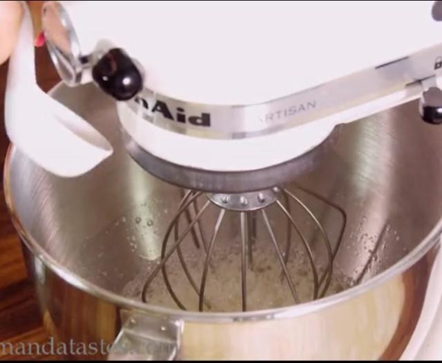再将混合玉米淀粉的细砂糖一勺勺倒入。