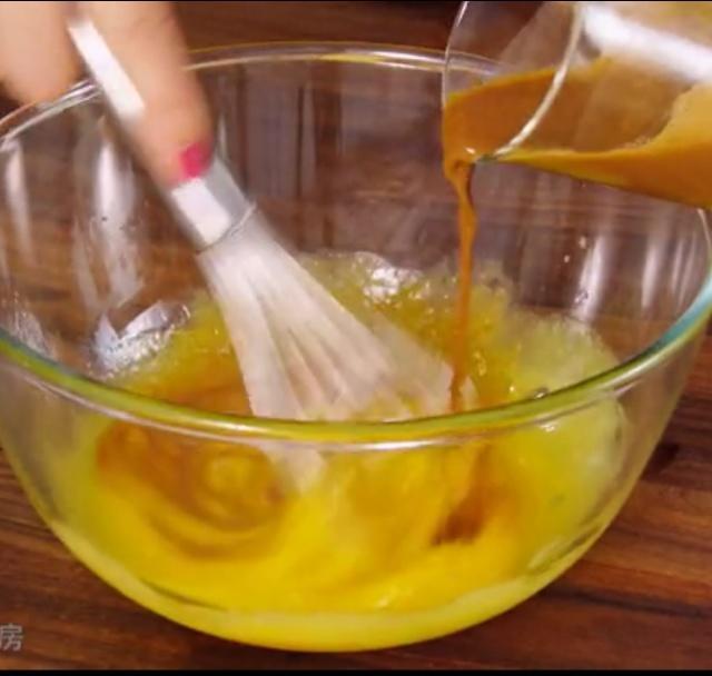 边搅拌蛋液边倒入植物油拌匀