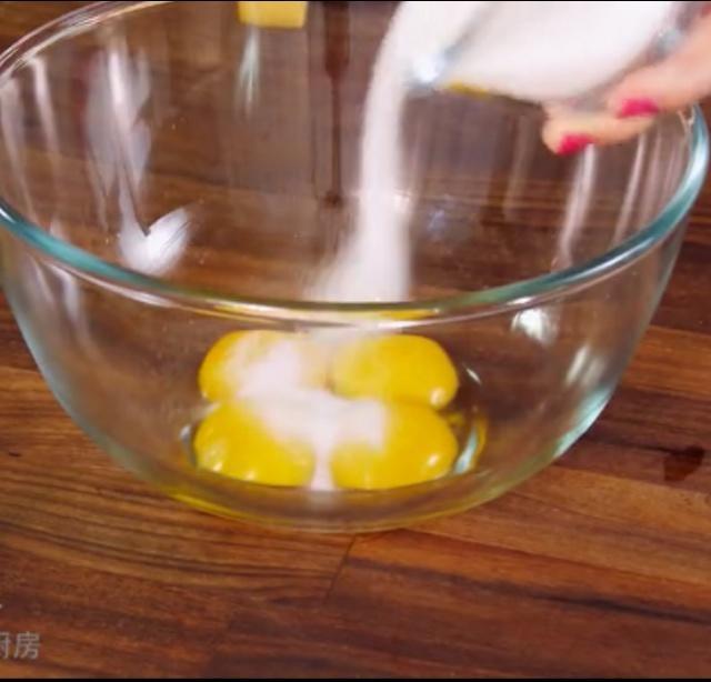 把蛋清和蛋黄分开,倒入两大勺细砂糖,均匀打散。