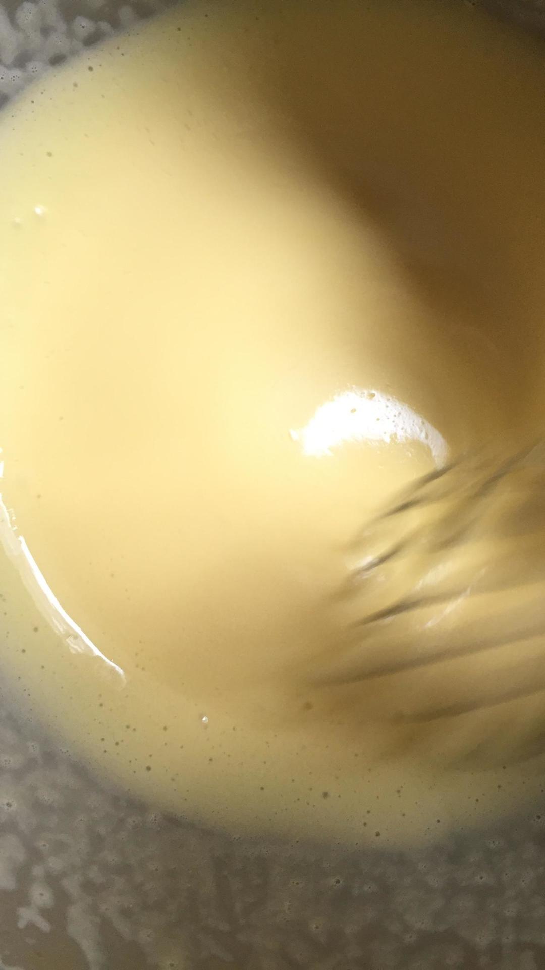 蛋黄用手抽打散加入10g细砂糖搅拌融化,加入牛奶,可以用水代替,搅拌均匀后加色拉油,我加了几滴自己用朗姆酒泡的香草荚酒,可以去蛋腥味,或者直接加一点朗姆酒也会让蛋糕增味噢!用手抽大力使劲打发,可以打圈,Z型,反正就不停抽打,大概五分钟,让蛋黄糊乳化。可以看到蛋黄糊的泡沫变细消失,呈浅色,比较稠的样子。