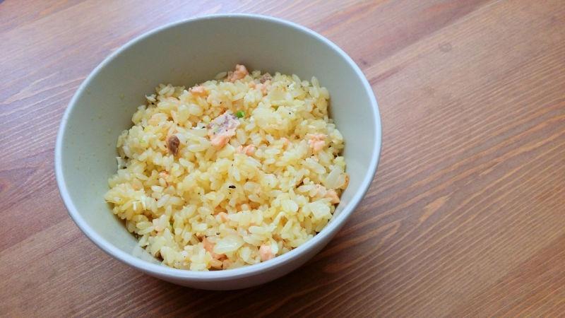 1. 饭是关键, 米和水1:1. 用隔夜饭比较好,水分少容易炒开 2. 如果米饭有点烂的话,可以先加点油把饭拌开,但是锅里就少加点油了 3. 鲑鱼先煎一下是为了容易去骨, 不要煎熟了, 不然肉就柴了 4. 如果鱼新鲜的话,鱼皮拿去炸透了,碾碎了洒在饭上也可以的