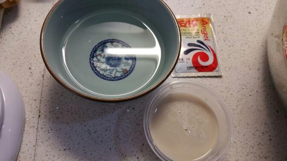 将酵母粉加水稀释,另准备些温水和面