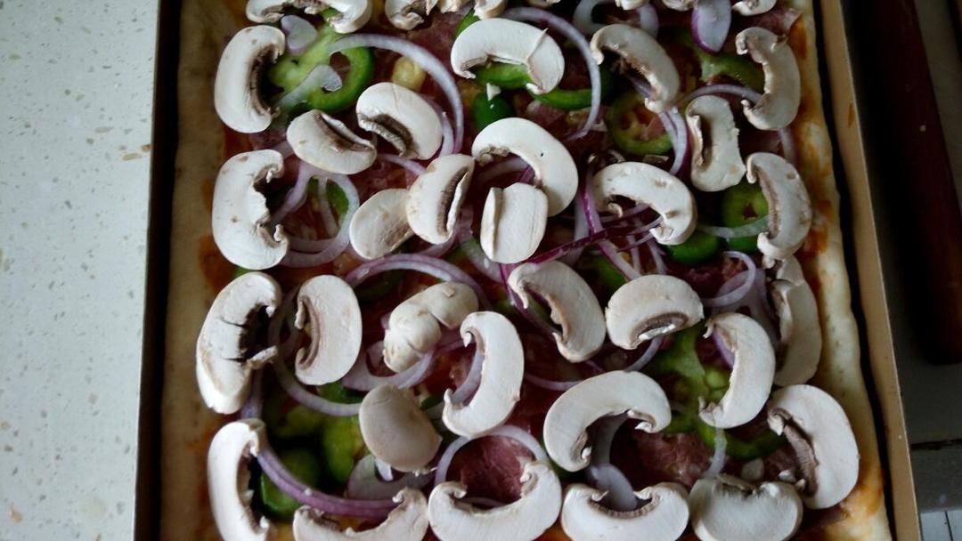 取出发好的面团,排气揉搓静置15到20分。将口蘑切薄片,洋葱和青椒切细丝,牛肉培根切小片备用。