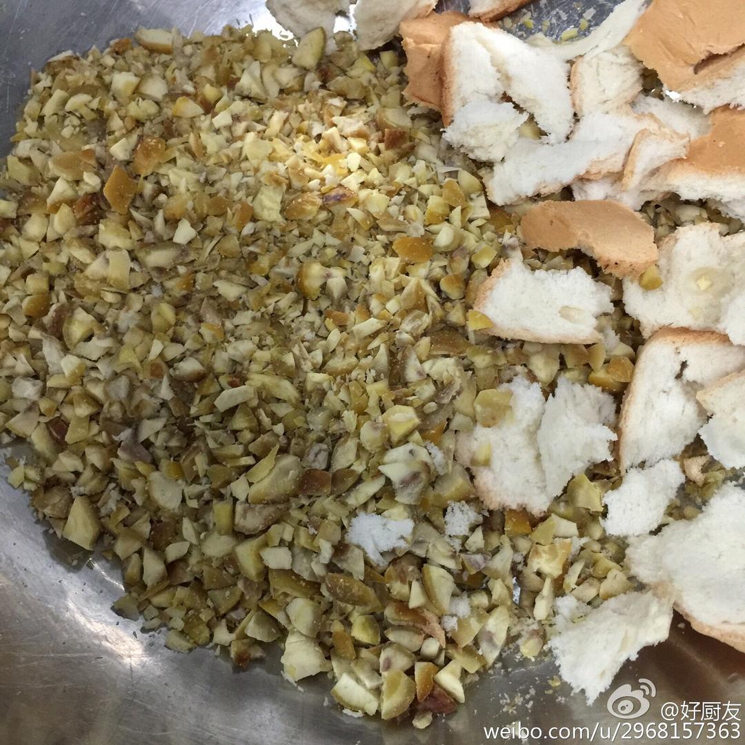 先将板栗(熟的)切碎,面包撕小块,不要撕太小。备用
