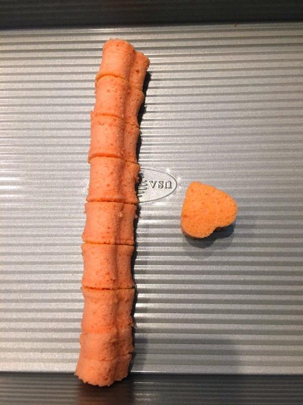 用心形的小模具,在蛋糕上切割出一个个小爱心,就像这样。图拍的丑哭了,见谅!