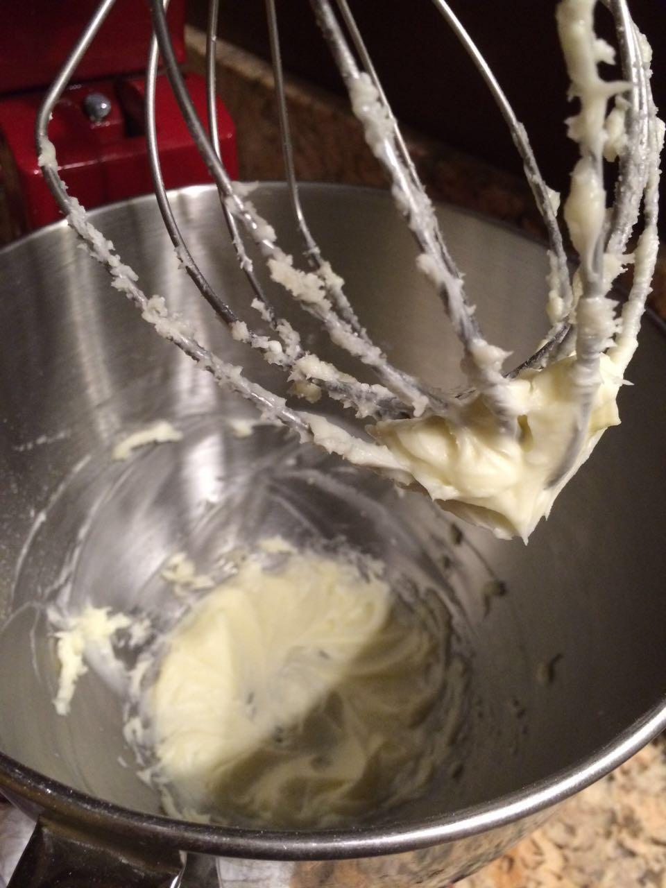 下面做彩绘面糊,把黄油提前放到室温软化。软化后的黄油和糖粉放到盆里,用打蛋器打到蓬松发白的状态