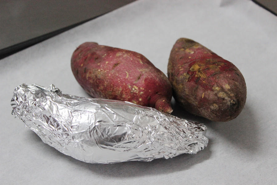 红薯内部的水分保存的也比较好。包锡纸的红薯口感更软糯。