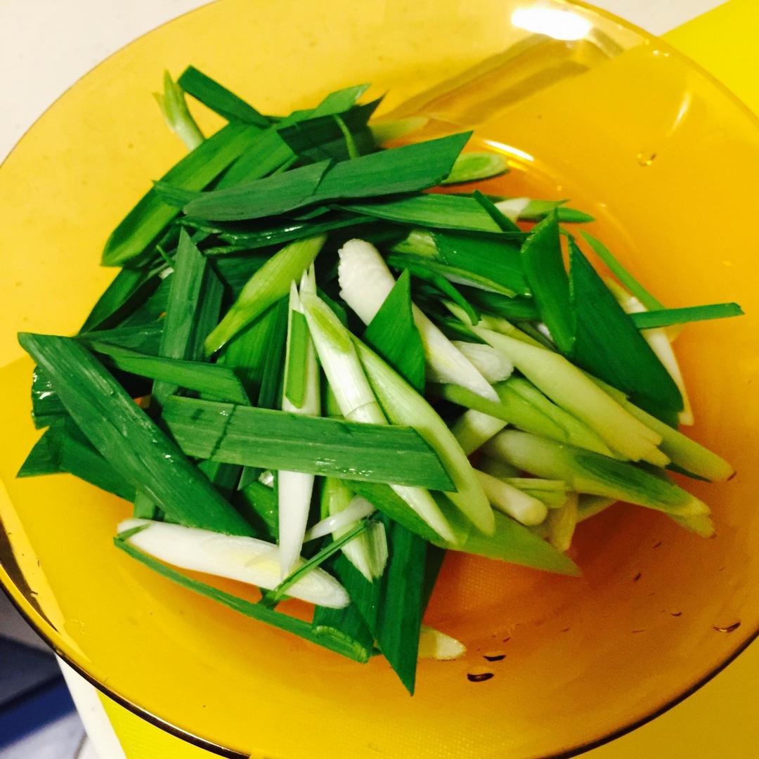青蒜洗净斜着切段(别太多哟,不要搞成青蒜里挑肉😄)。