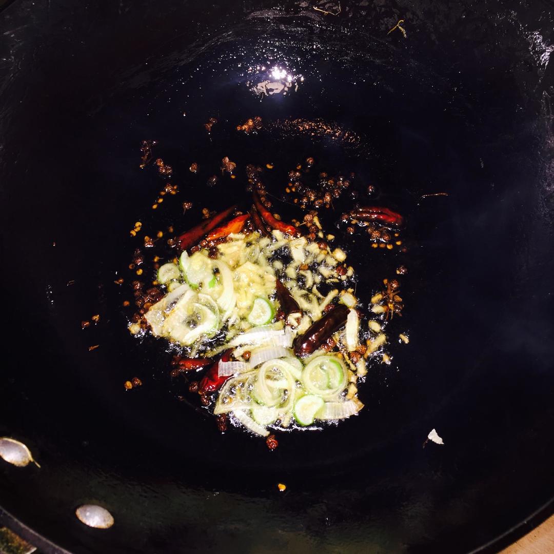 比平时炒菜油多放一点,油热煸香花椒和辣椒,不用捞出。