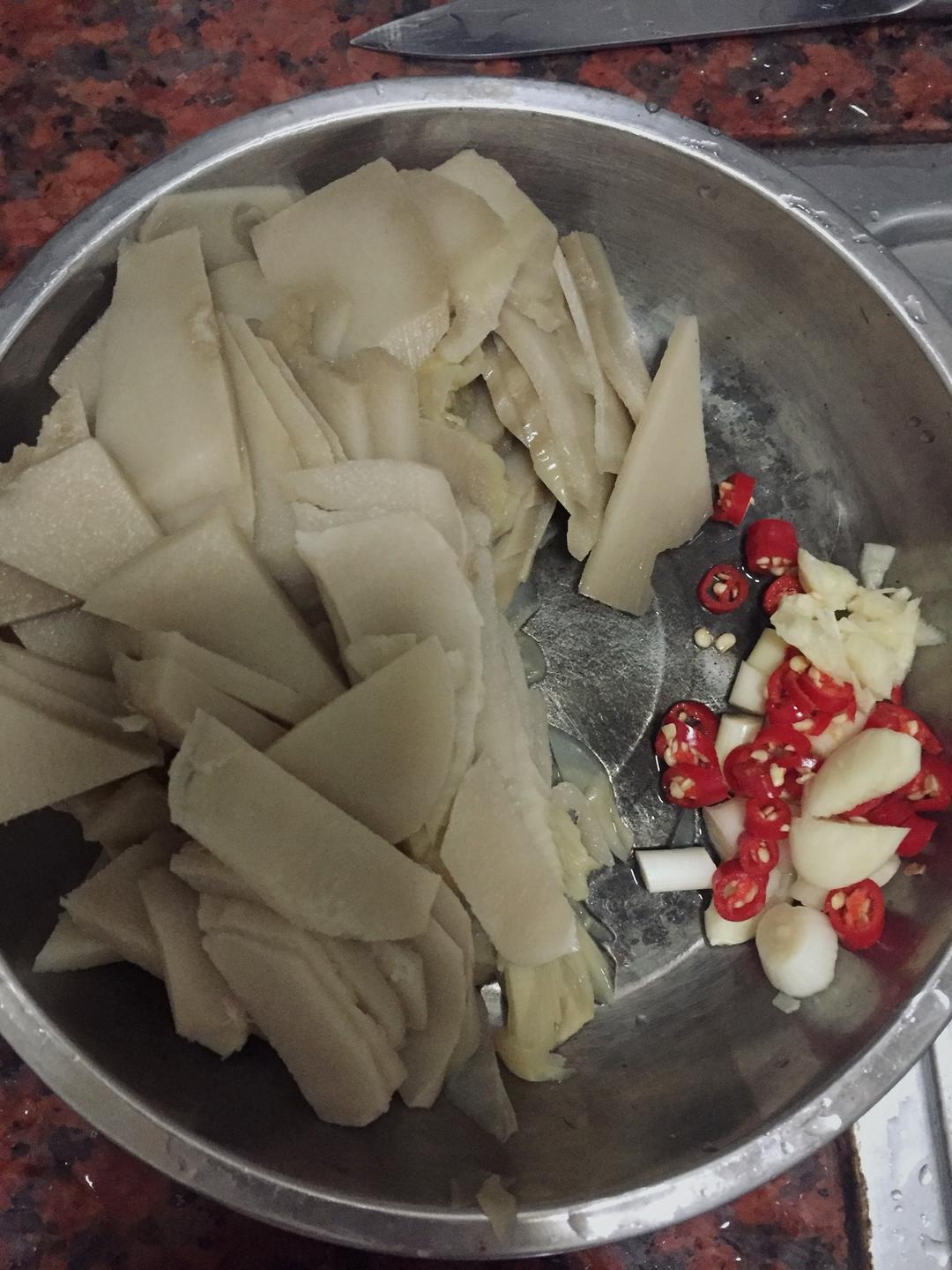 酸笋是自家腌制的,切片备用,同时放一些蒜头和红尖椒备用。