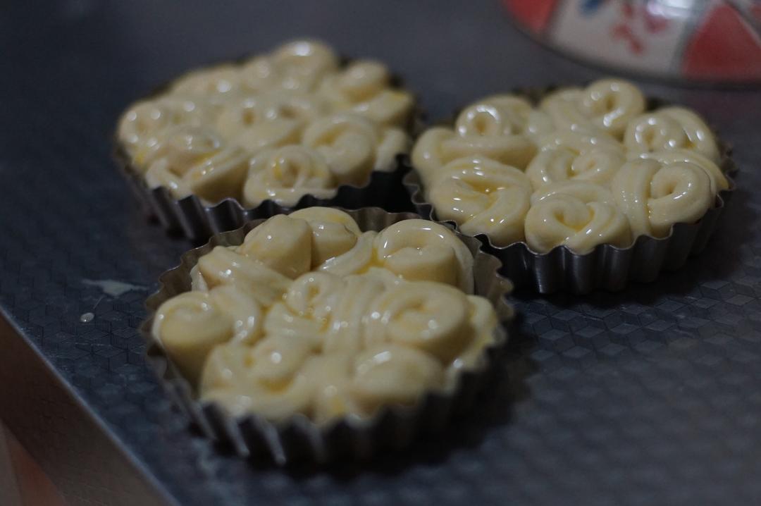 把切开的面卷依次摆在派盘边缘