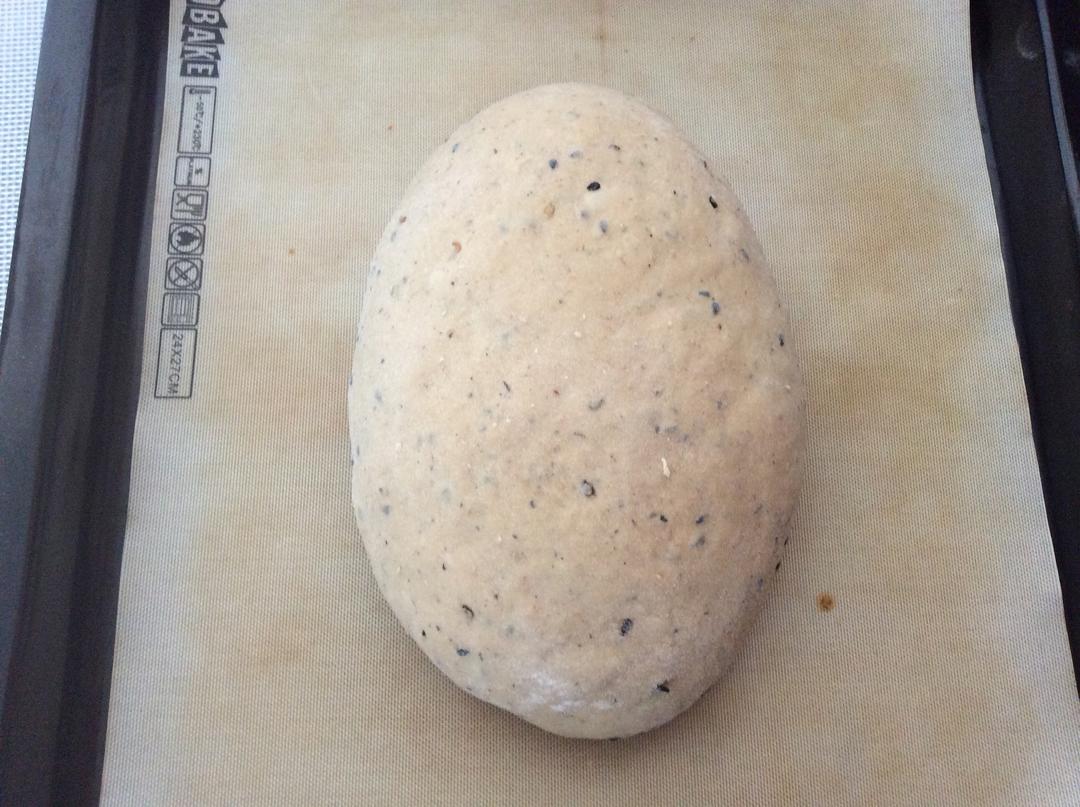 烤盘放油纸或者硅胶垫,发好面团取出,在案板上轻柔几下,用手整理成椭圆形。