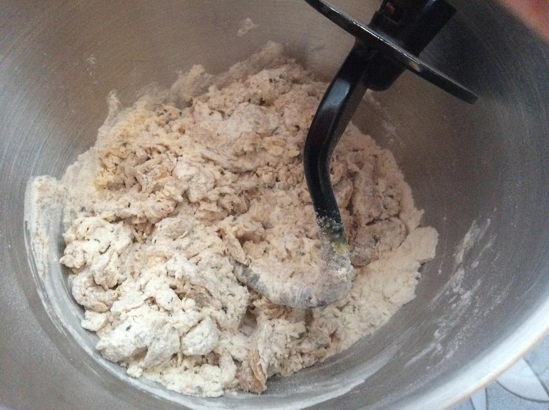 用厨师机钩子搅拌后放到厨师机上,5分钟一档5分钟2档。如果没有厨师机的厨友可以在盆里面干湿料混合,搅动成团后,取出放在撒了面粉的案板上揉5-10分钟,揉到面团圆润光滑,有弹性。