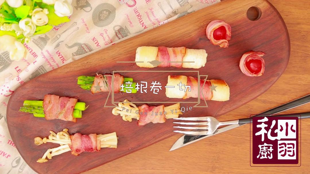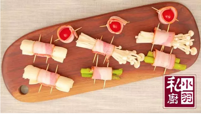 ▲这样四种培根卷就做好了,可以煎也可以烤,烤的话放到175度的烤箱,烤10-15分钟就可以。