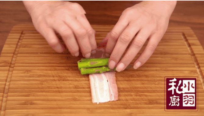▲培根铺在案板上,放上三段芦笋,慢慢的卷起来,然后用牙签固定一下边边。