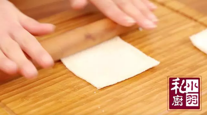 ▲吐司面包切掉四边儿,用擀面杖擀薄。所有的准备工作做完了,就可以开卷了。
