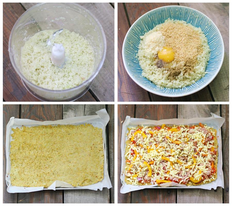 调好味的花椰菜平铺在烤盘中,送入预热好的烤箱中,200度,烤10分钟,表面金黄即可,作为披萨的饼底