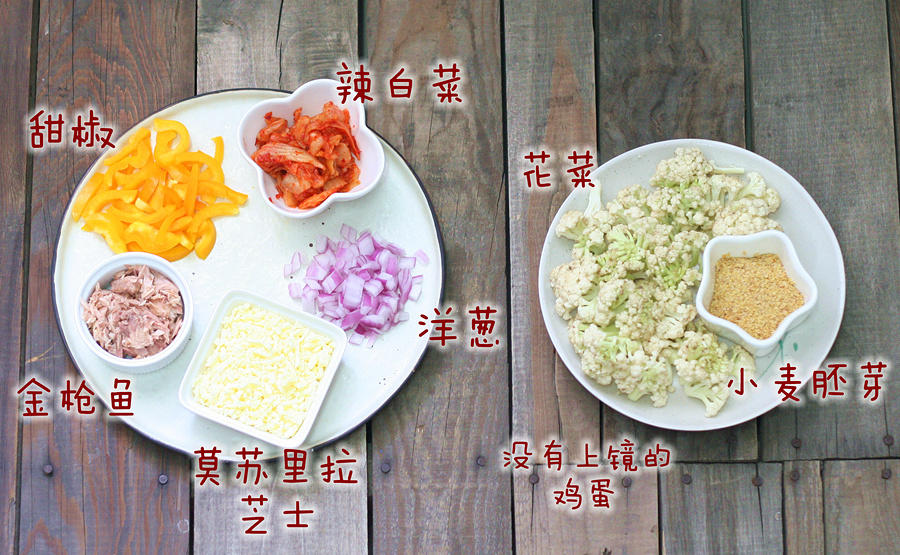 花椰菜中加入小麦胚芽、鸡蛋、芝士粉、黑胡椒、盐、披萨草粉、罗勒粉混匀。泡菜切碎,彩椒切成圈
