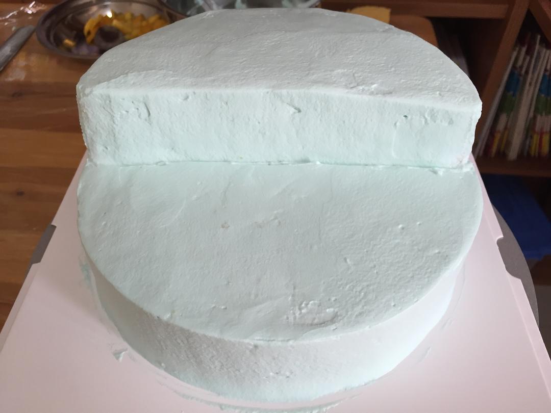 两个半片蛋糕叠加,中间也是夹奶油和水果。抹好面后入冰箱待用。