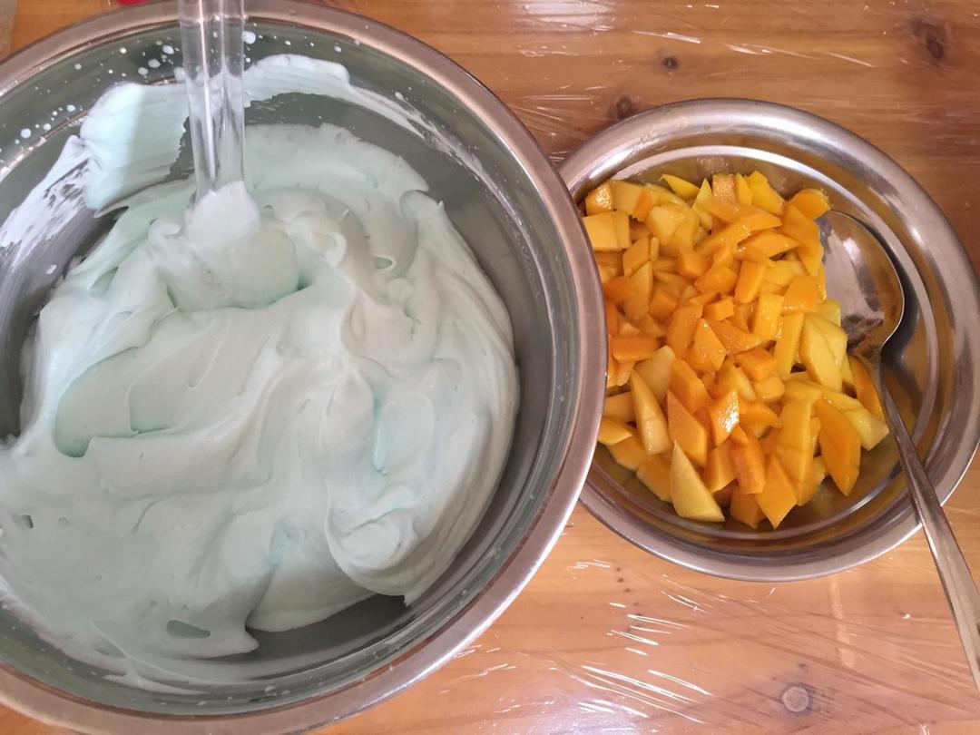淡奶油500克左右➕一点蓝色色素打发到九成接近十成发,再用软刮刀翻拌均匀,备好水果,首选当然是芒果啦!