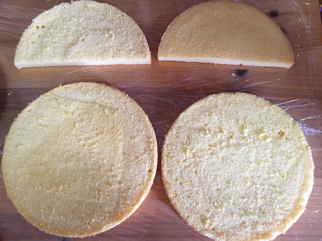 戚风分三片,其中两片做底座,另外一片分成两半做上层部分。