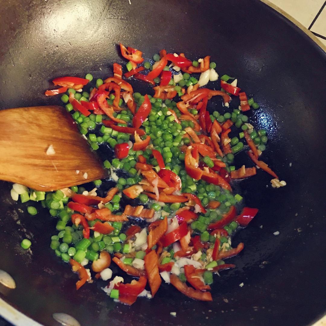 锅里放油(比平时稍多一点点),油热下一小部分姜蒜末爆香入蒜苔红椒,火不需太大,只需翻炒几下,扒拉到锅的一边