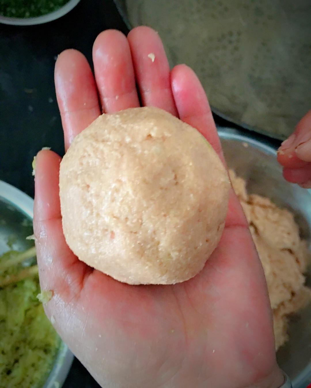 抓一块土豆泥,用手拍扁,加馅,用打圈的方式包。