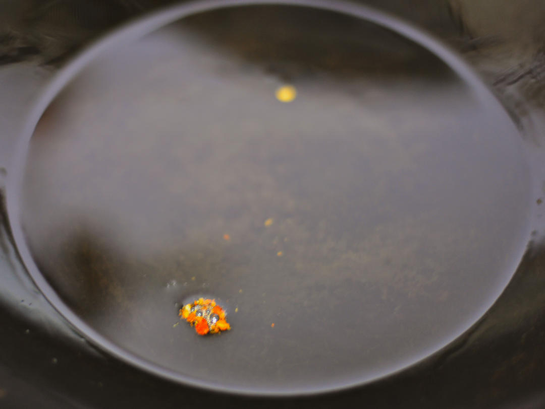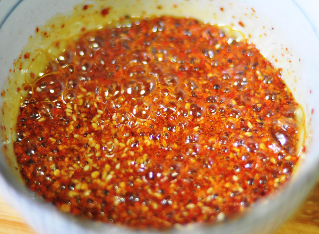 将热油直接浇在芝麻辣椒面中。如果不嫌麻烦,也可以提前准备一些去皮的油炸花生米碎放入油辣椒中会更香。