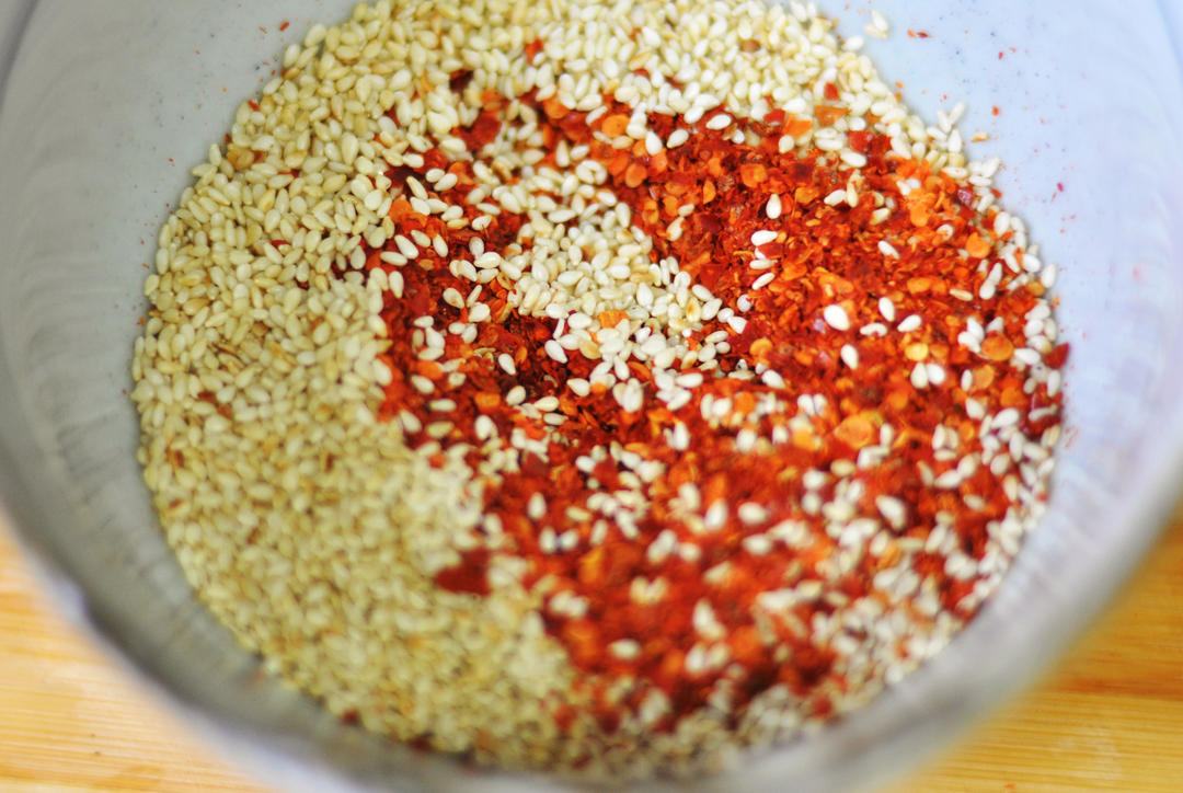 在一个干净无水的碗中放入辣椒面和白芝麻。