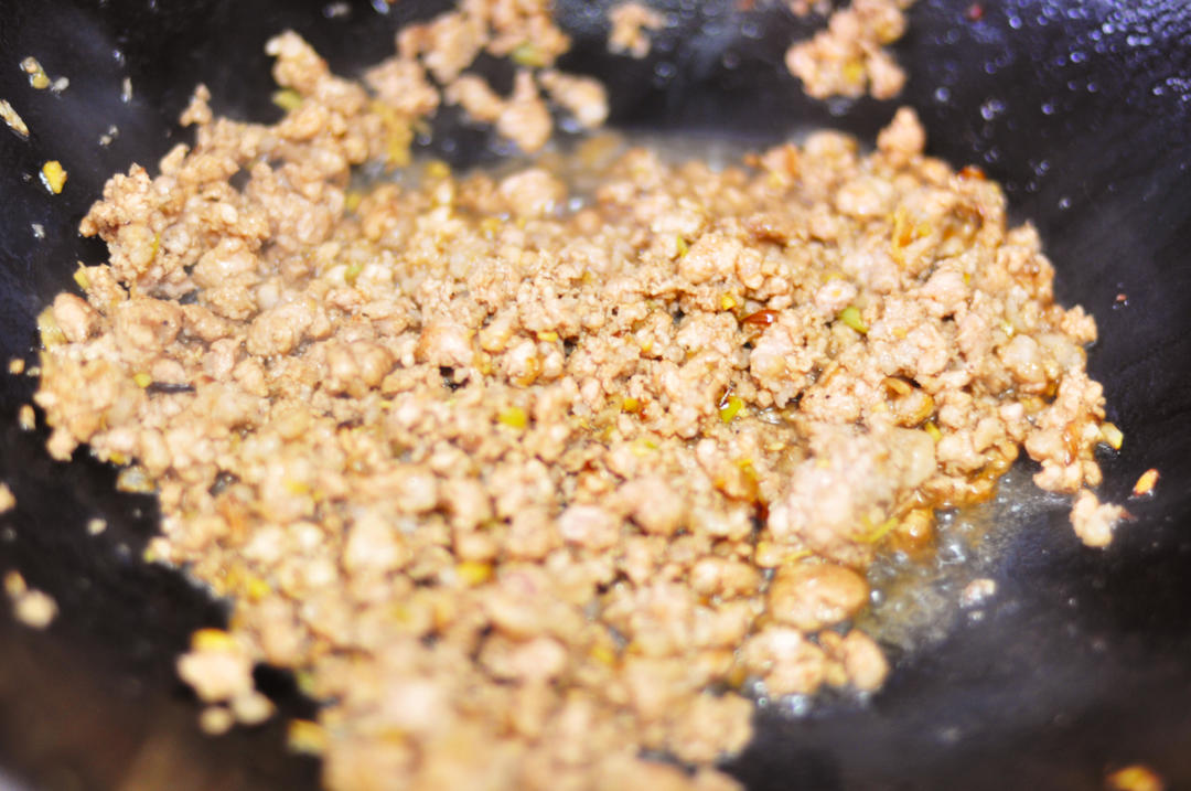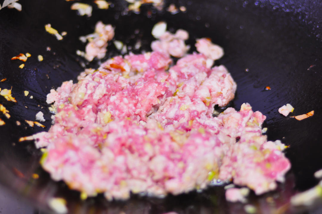 肉馅入锅后翻炒几下,感觉锅已热了,就放入料酒。随即放入生抽、盐翻炒。