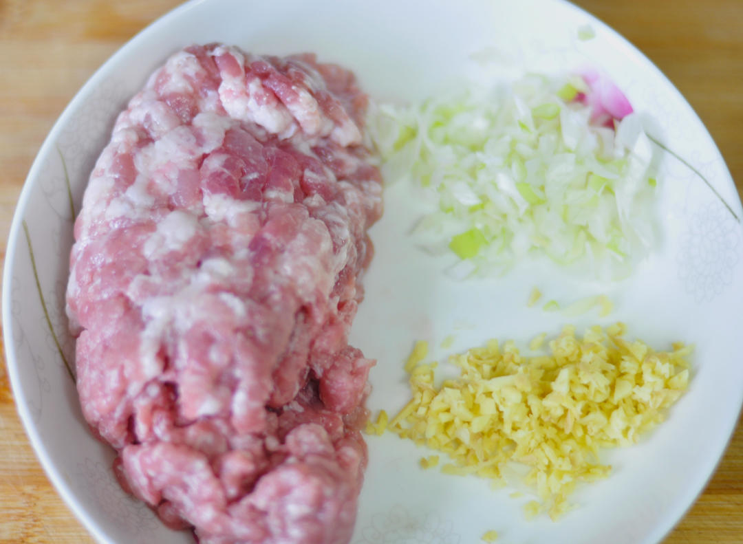 准备肉馅、姜末和葱末。锅里放入油,在油温还不热的时候放葱姜末炒至有香味,放入肉馅。