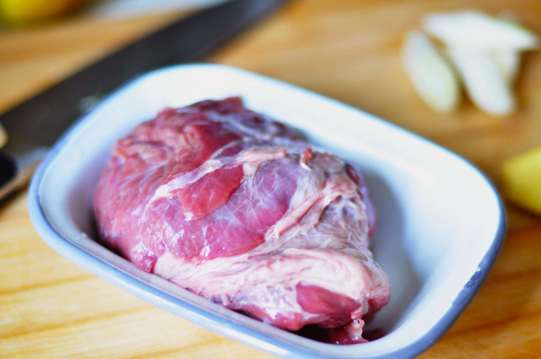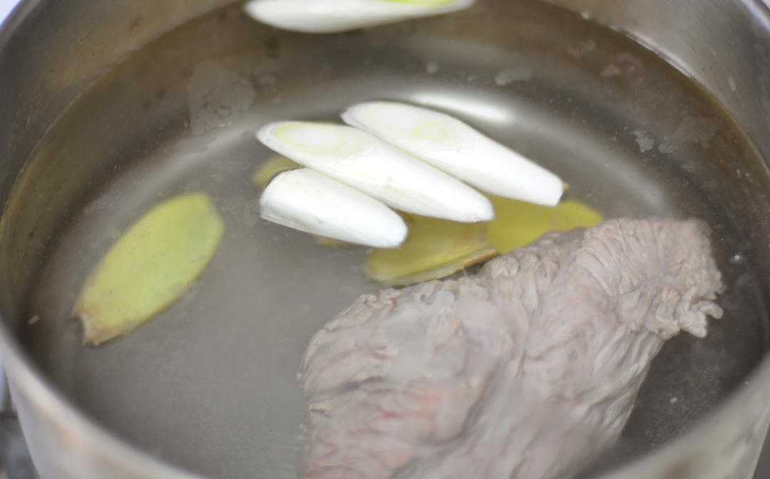 国内重新盛满冷水,约1500ml。放入牛腩和葱段、姜片。大火烧开,转小火慢炖1个半小时左右。可以用筷子插入牛腩内部,表明肉已经好了。个人不喜欢太烂的牛肉,感觉没有嚼劲,如果喜欢特别烂的口感的,可以延长炖煮时间。煮好后牛肉拿出切片,汤备用。
