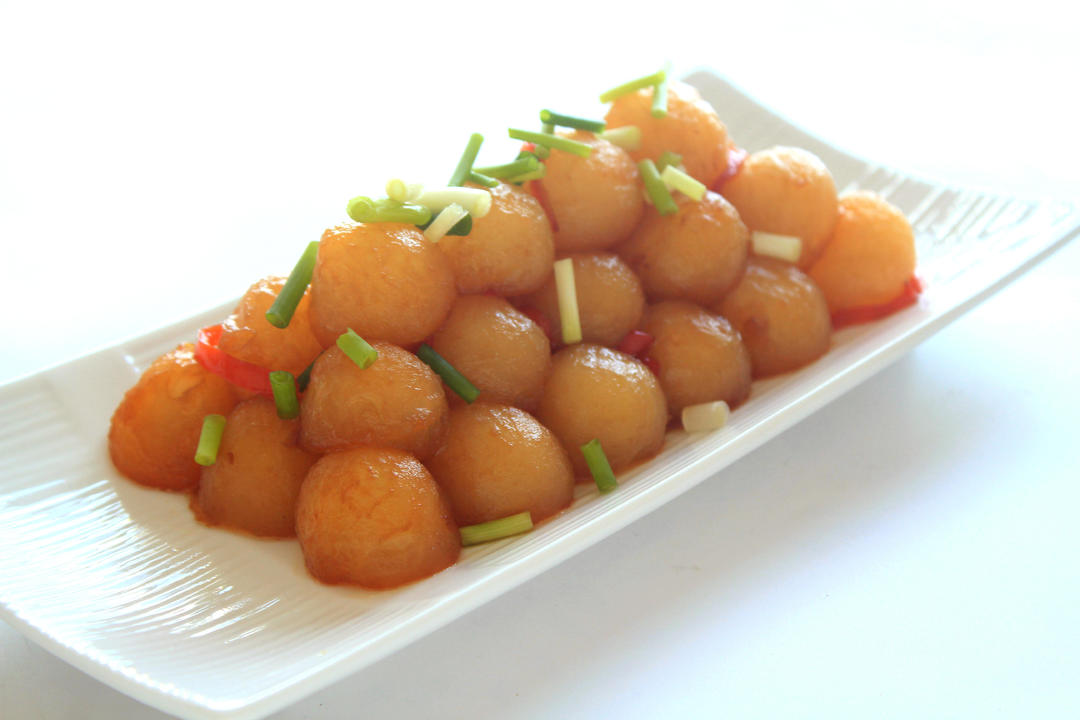 锅烧温放入食用油、砂糖,待砂糖融化,放入冬瓜丸子炒至上糖色;接着放入红椒丝、生抽炒匀,最后加入适量盐调味,即可起锅。冬瓜丸子码好后,撒上葱花,即可上桌享用。
