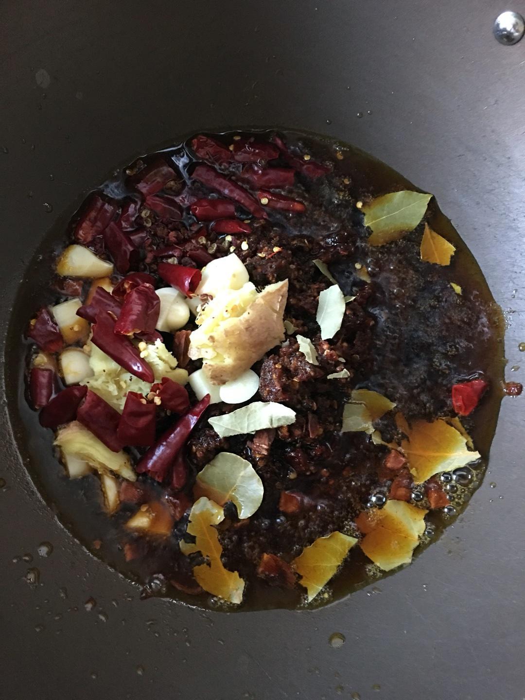 炒料:等炒出香味,加入豆瓣酱炒制(不要糊了)