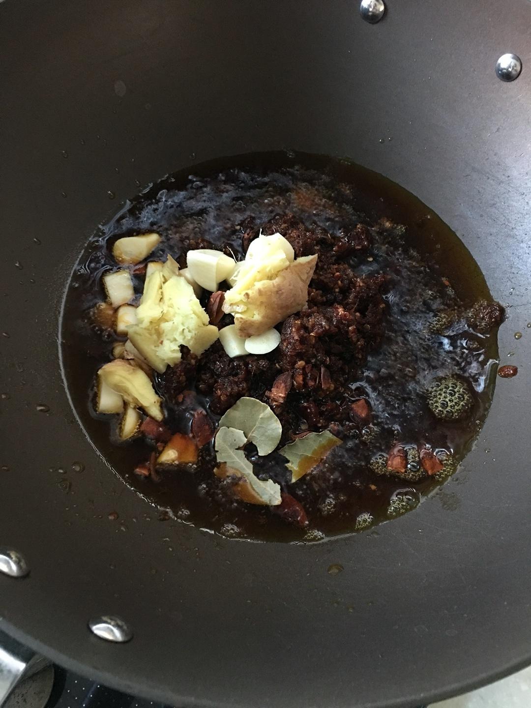 炒料:锅里做油,最小火,加入胖子鱼作料、姜片、蒜瓣、香叶、八角、干辣椒、干花椒炒制