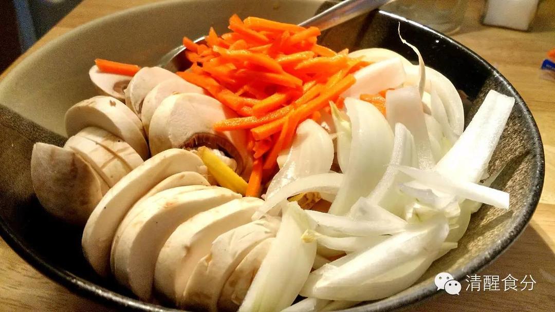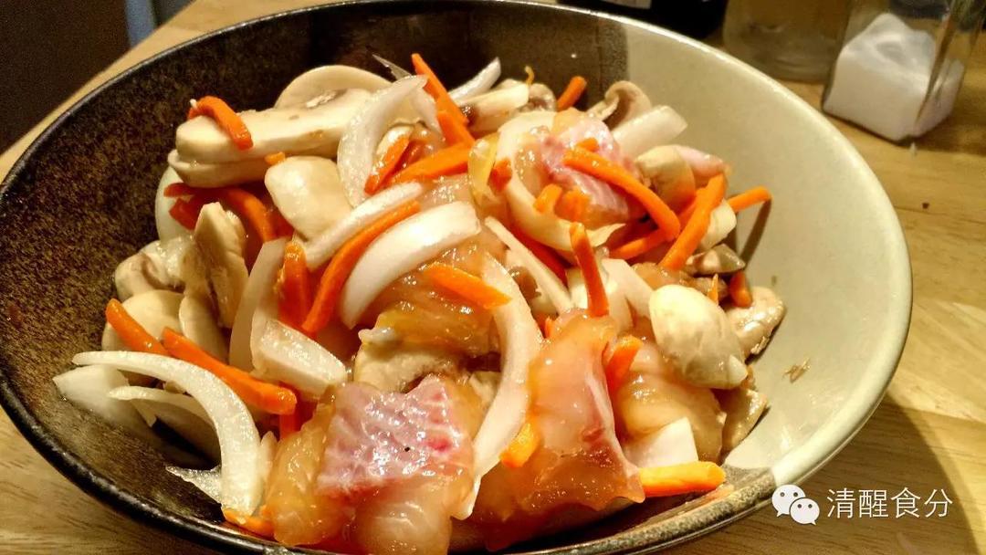 蘑菇切片,洋葱切丝,连同其他蔬菜一起放入腌鱼肉的大碗;