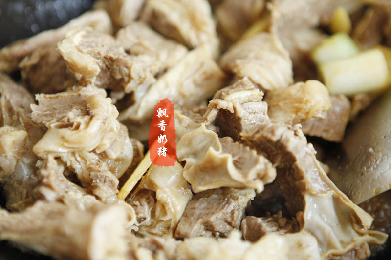 坐锅开火,锅内放油,油热后下入待用的牛腩,大火翻炒。