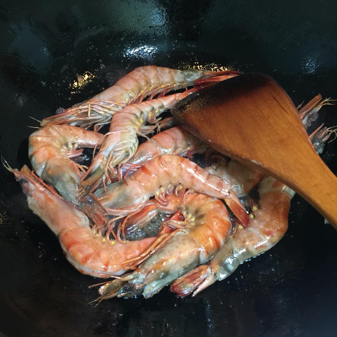 油热把虾倒入锅内,翻炒几下等待大虾变成红色。
