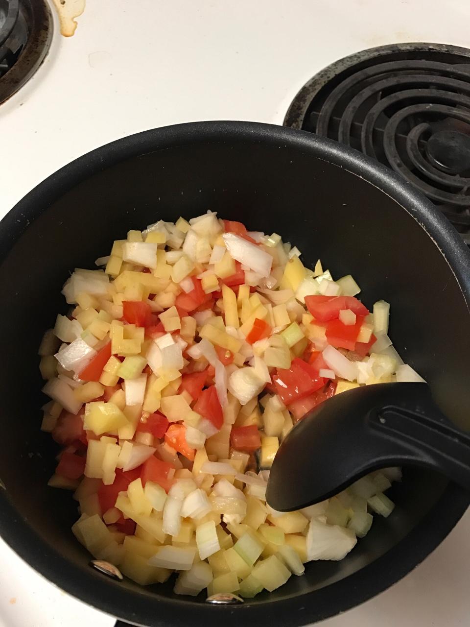融化之后倒入蔬菜丁,用勺子搅拌几下