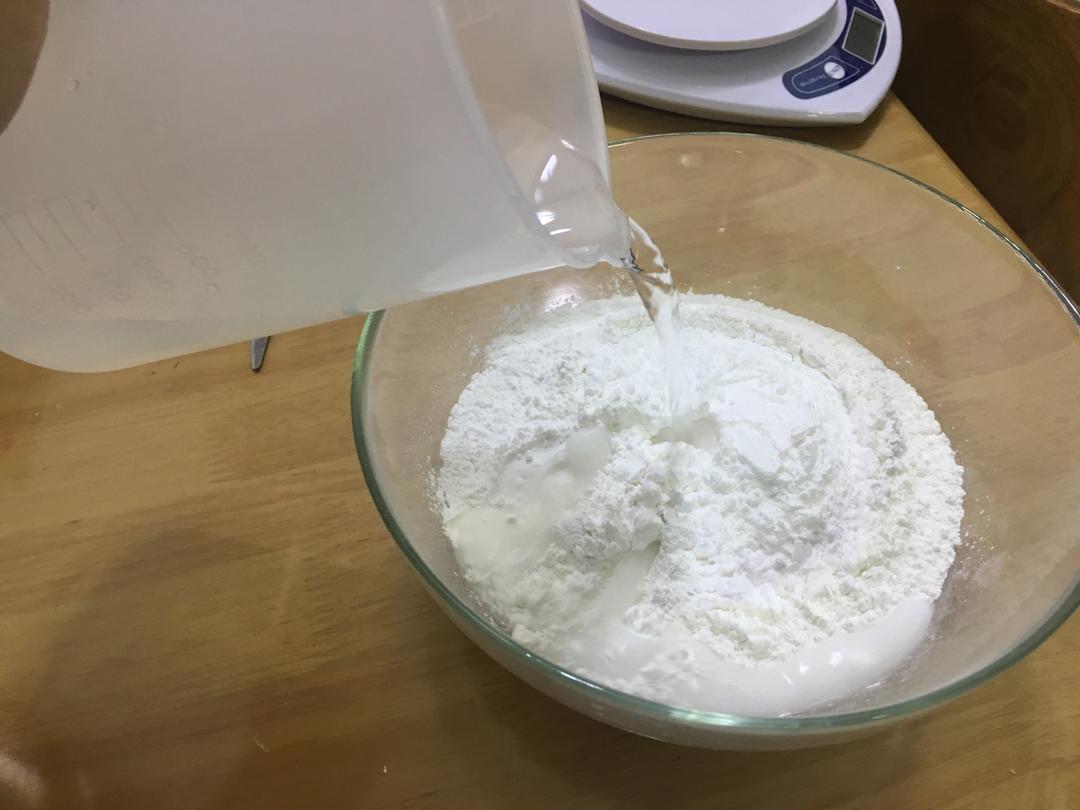 水磨粘米粉220g+澄粉40g兑300g水搅拌成粉浆备用;