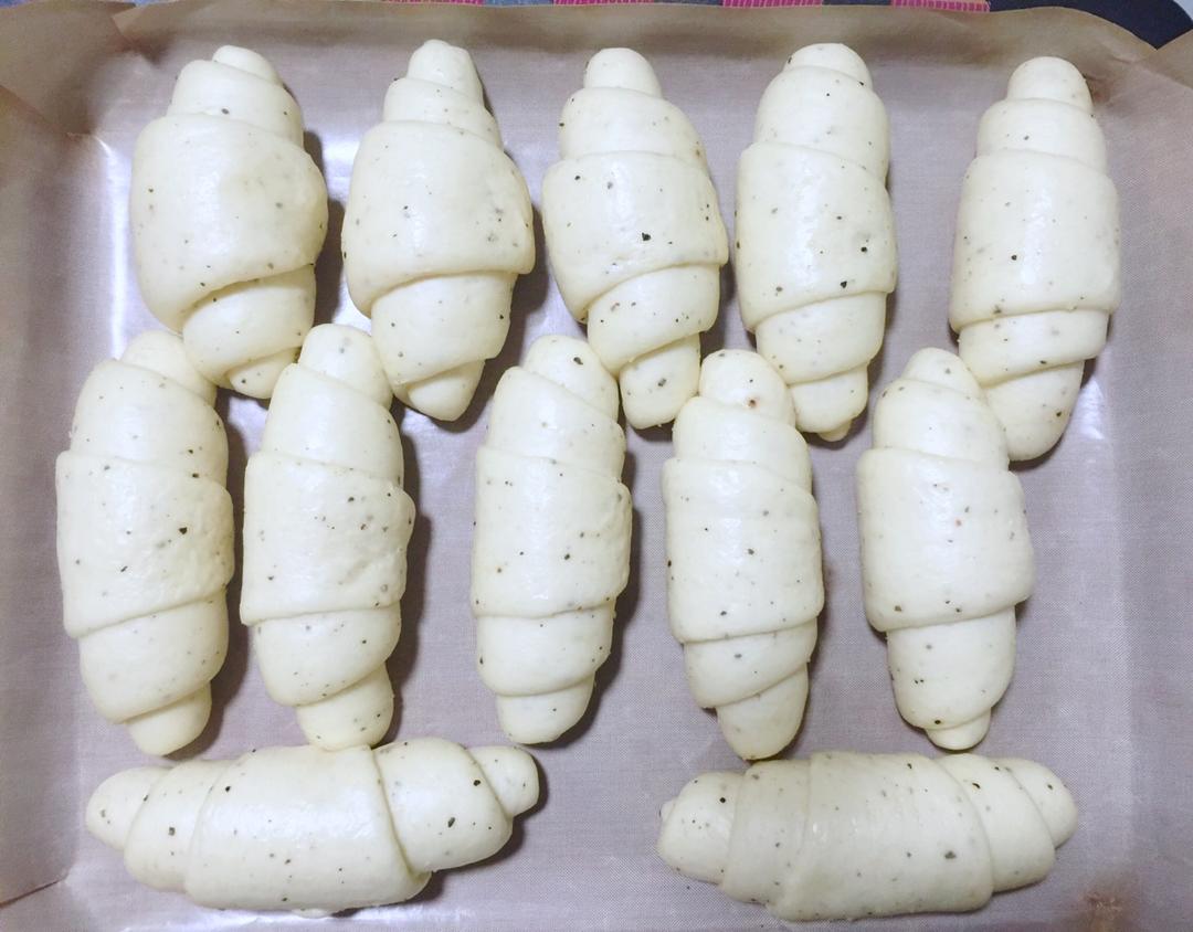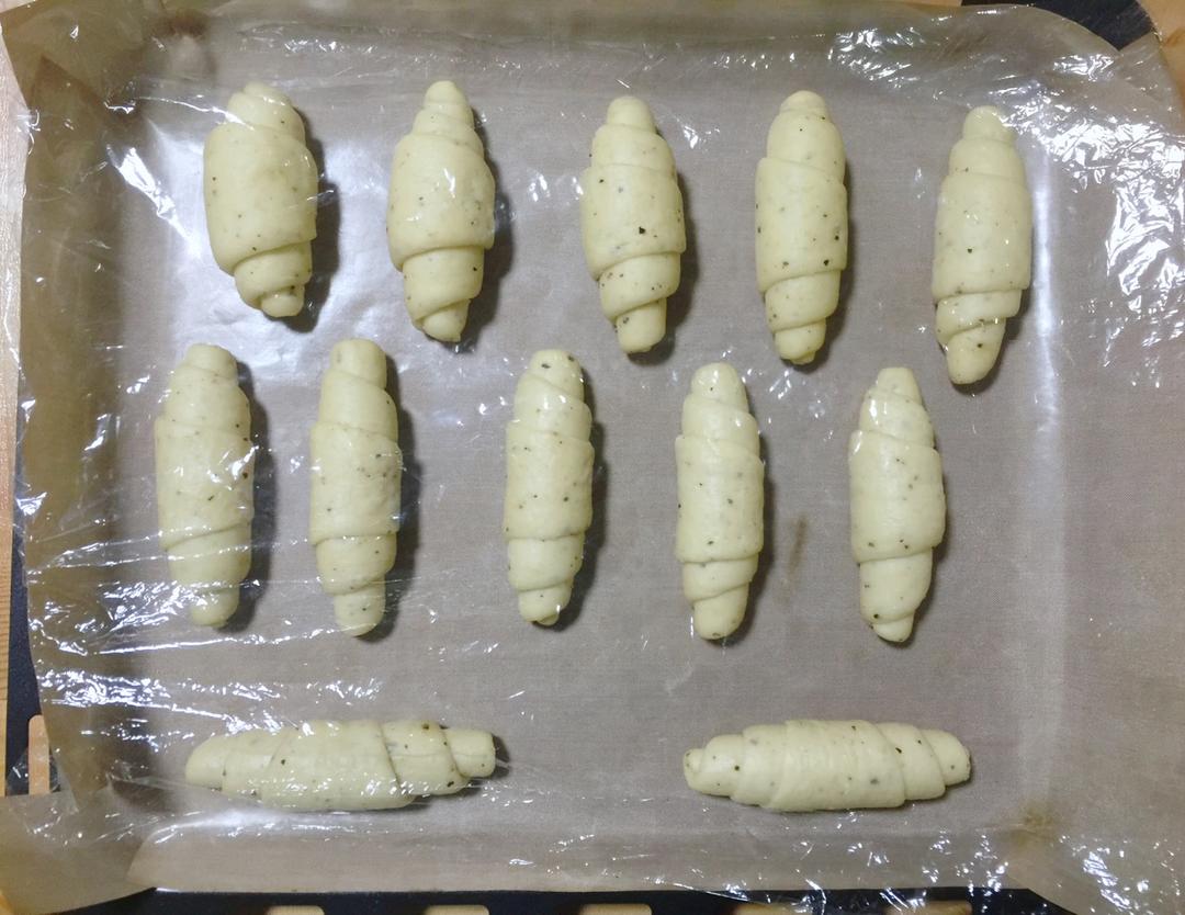 将卷好的依次放入烤盘,盖上保鲜膜,在温度35–38度、湿度70%–80%的环境中进行二发。大约用时45分钟左右。(请自动忽视本喵那不咋样的整型😝😝)