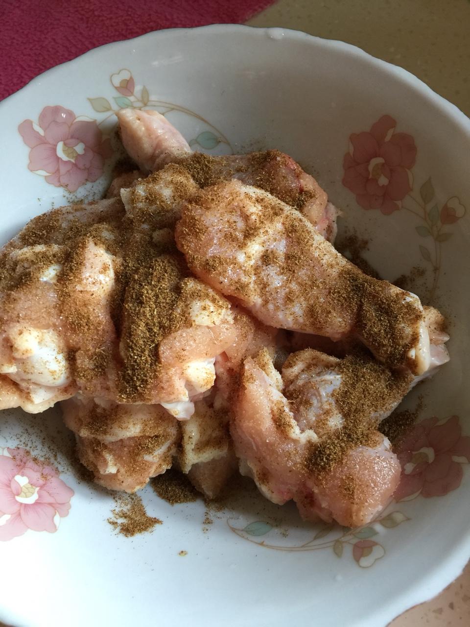 将鸡翅根洗净控干水分,撒上适量盐、孜然粉。充分马杀鸡(按摩😁),腌制半小时以上。最好当天吃当天做,不用腌制过夜,这样嫩一些。