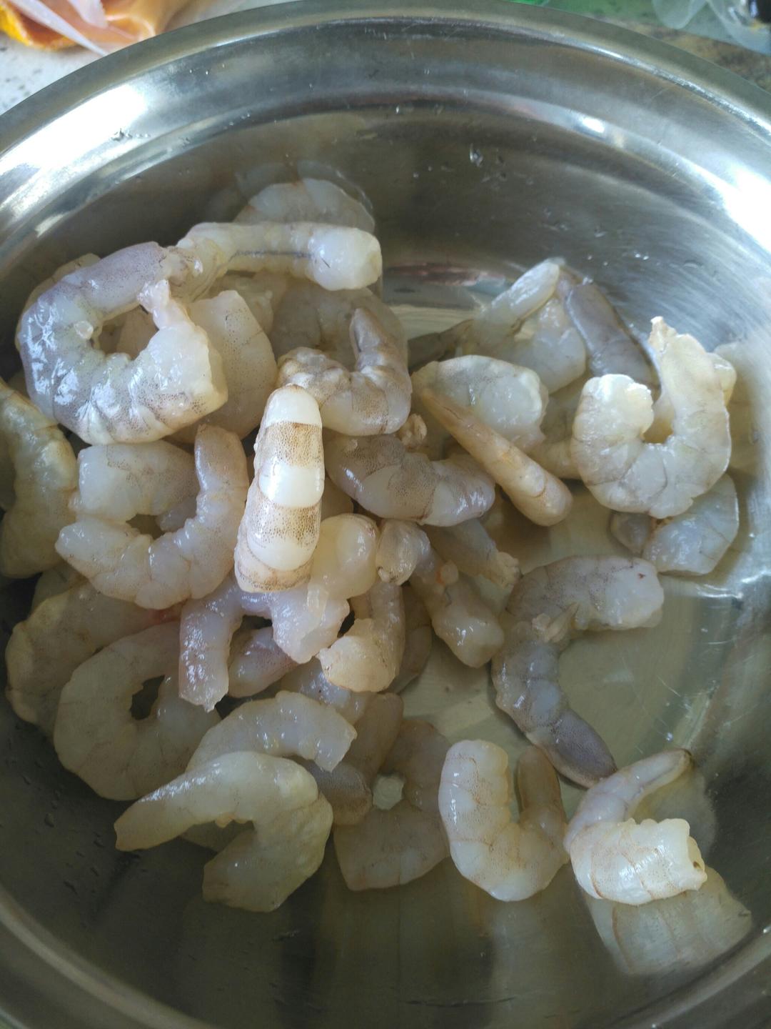 虾仁解冻,洗净,抽取沙肠。就是虾里面那根黑黑的细线。用牙签挑出来,嫌麻烦不弄的话。味道会差很多。当然有很多虾仁,其实因为一些原因,里面沙肠很少。